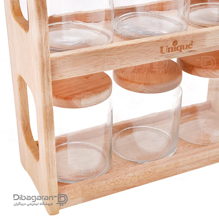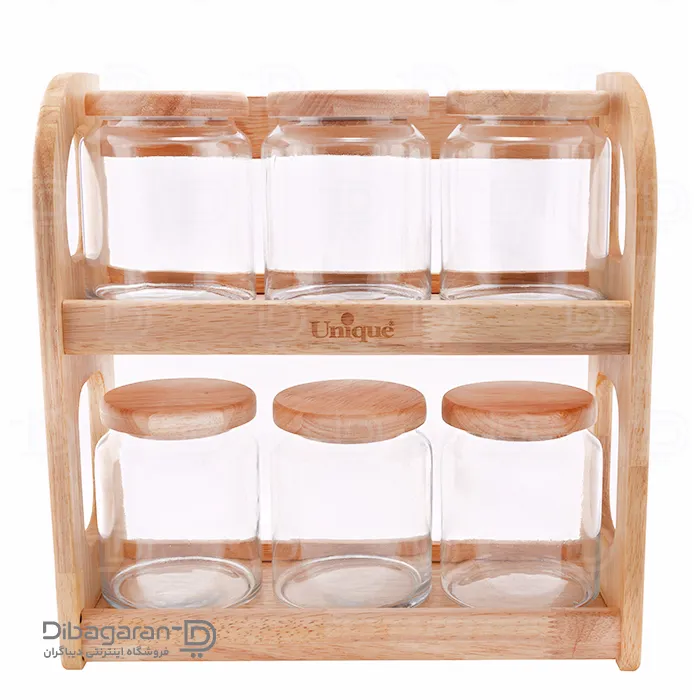 پاسماوری 7 پارچه یونیک مدل دو طبقه کد UN-6127 یک محصول ساده و شیک است که وجود آن نظم و زیبایی خاصی به فضای آشپزخانه شما می‌بخشد. این سرویس دارای 6 عدد بانکه با بدنه شیشه‌ای و درب چوبی است که بر روی یک استند ثابت از جنس چوب قرار گرفته اند تا دسترسی آشپز به حبوبات آسان شود.