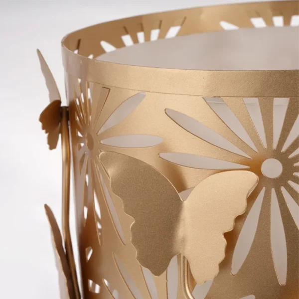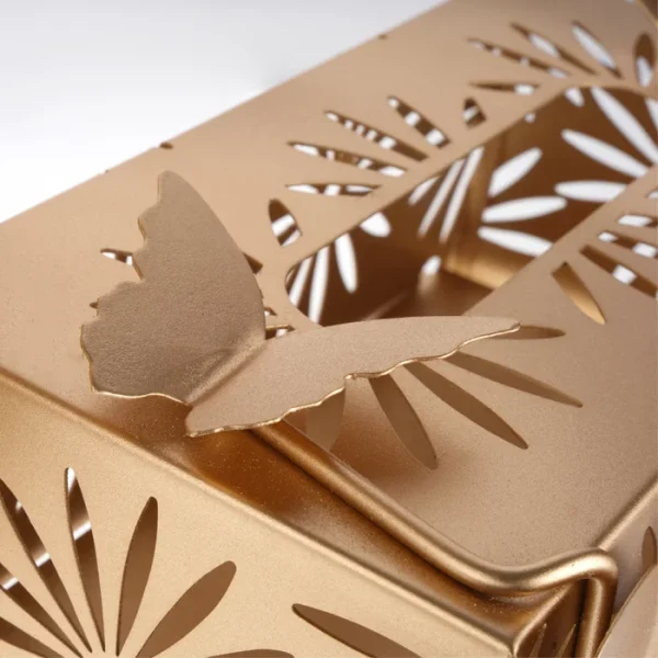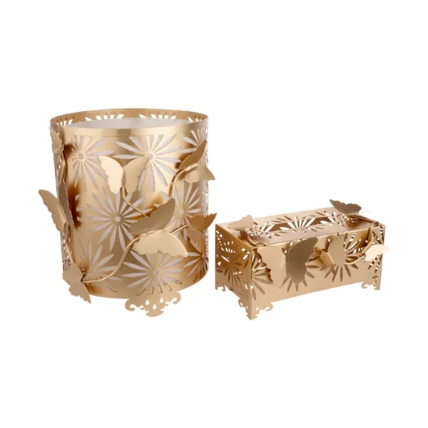 این جا دستمالی از جنس فلز و به رنگ طلایی است، نقوش پروانه و گل از مرکز به جعبه متصل و از اطراف برجسته هستند. نقوش سطل زباله هم مانند جعبه بوده و داخل آن یک سطل پلاستیکی وجود دارد که هم از کثیف شدن سطل فلزی جلوگیری میکند هم خالی کردن زباله از آن آسان است.