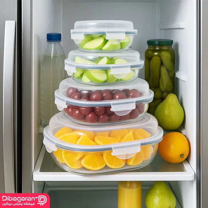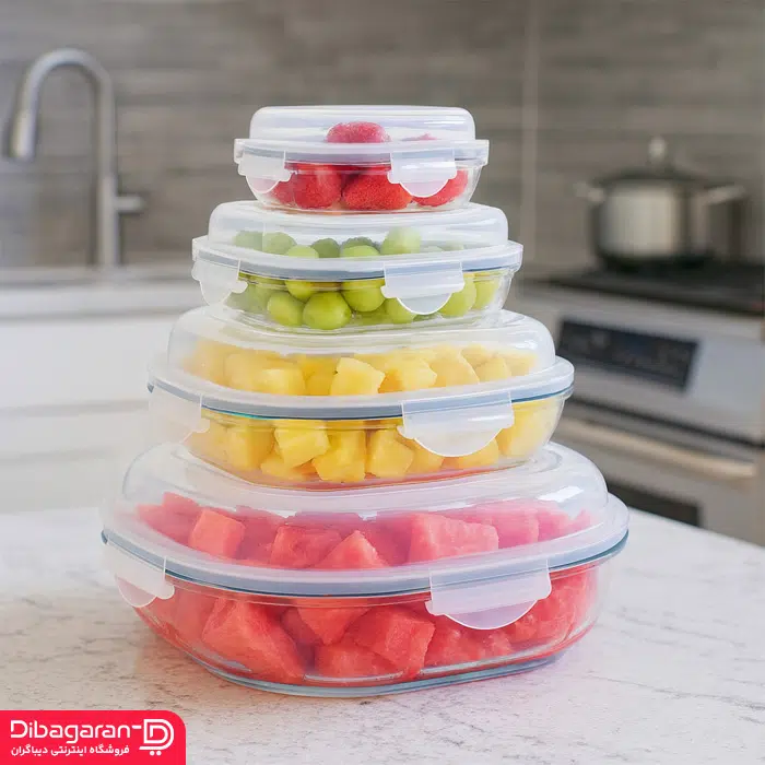 این ویژگی باعث می شود مدیریت مواد غذایی ساده تر شود و از فراموش شدن یا خراب شدن غذا جلوگیری گردد. شیشه بودن این ظروف نگهدارنده باعث می شود طعم و بوی مواد غذایی تغییر نکند و کاملا بهداشتی باقی بماند. درب هر ظرف به صورت قفل دار طراحی شده و به خوبی روی بدنه قرار می گیرد. این درب ها مانع ورود هوا و رطوبت می شوند و به حفظ تازگی مواد غذایی کمک می کنند. چفت های اطراف درب، استفاده از ظرف را ایمن تر کرده و از نشت مواد غذایی در یخچال یا هنگام جابجایی جلوگیری می کنند.