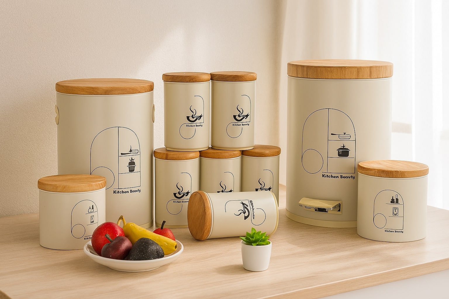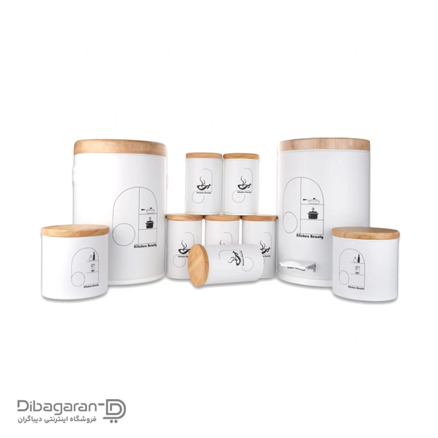 محصولات موجود در این سرویس شامل 10 قلم میشوند: یک سطل برنج، سطل زباله، 2 عدد قوطی برای حبوبات، 6 ظرف ادویه. این مجموعه ظروف نگهدانده، از استیل ضد زنگ ساخته شدند و درپوش آنها نیز از جنس چوب بامبو درجه یک بوده و بو نمیگیرد. این ظروف آشپزخانه با استفاده مداوم و شستشو کدر نشده و زنگ نمیزند.