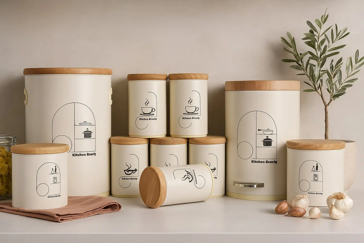 اقلام سرویس آشپزخانه مات 10 تکه دلوین کرم با درب بامبو