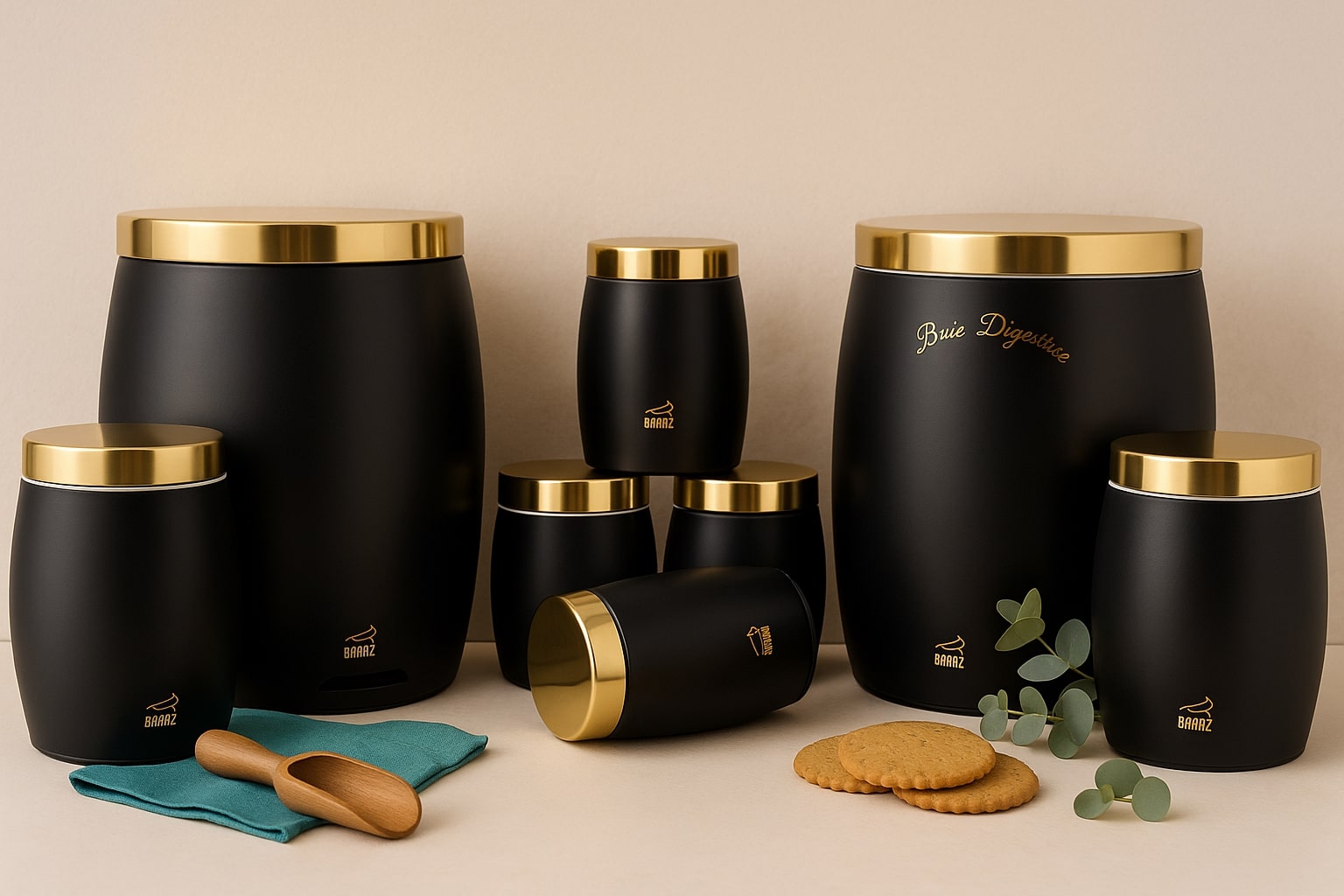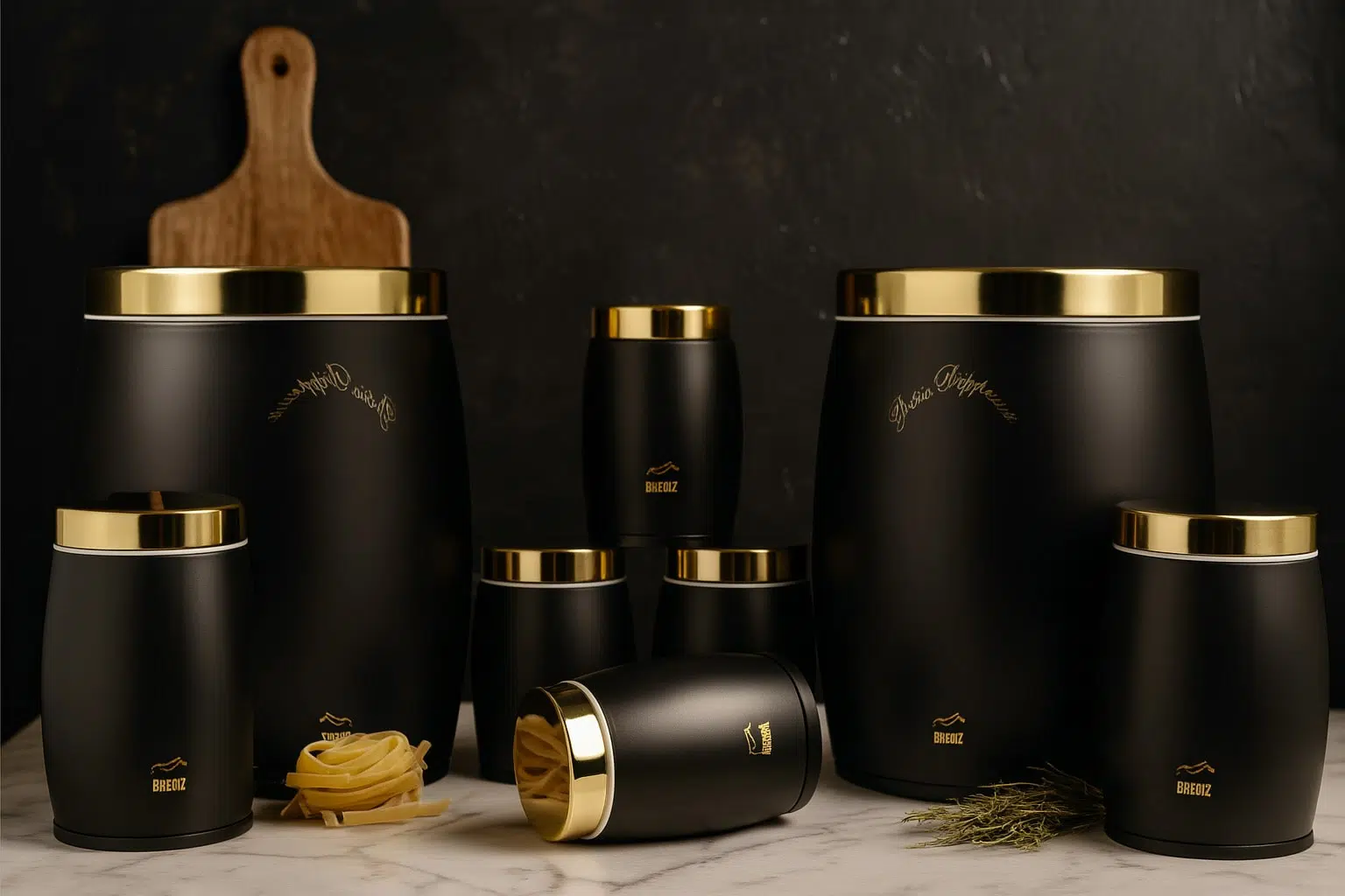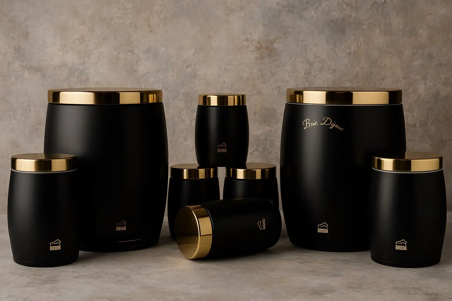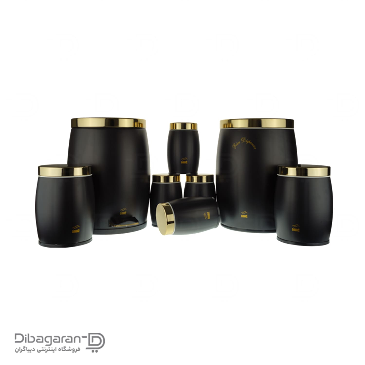 یکی از مهم ترین لوازمی که برای جهیزیه عروس استفاده می شود انواع سرویس آشپزخانه است که اگر ست نیز باشد زیبایی بیشتری به دکور آشپزخانه شما میبخشد. سرویس آشپزخانه 8 پارچه بهاز کالا کد 01210 تمام ویژگی های یک ست زیبا و کامل را دارد. این محصول دارای 8 تکه مجزا شامل سطل زباله و بانکه در سایزهای مختلف برای نگهداری برنج، حبوبات و ادویه می باشد. پس اگر شما هم قصد خرید جهیزیه و یا تغییر دکور آشپزخانه خود را دارید ما ست آشپزخانه مشکی با درب طلایی 8 تکه بهازکالا را به شما معرفی می کنیم.