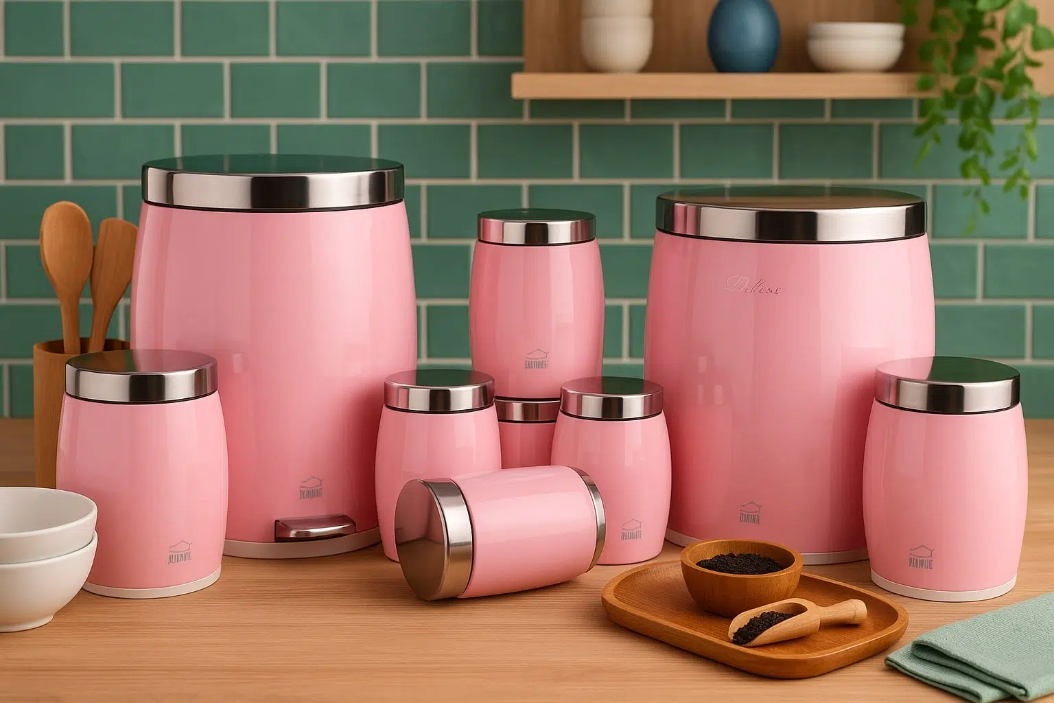 این محصول دارای 8 تکه مجزا شامل سطل زباله و بانکه در سایزهای مختلف برای نگهداری برنج، حبوبات و ادویه می باشد. پس اگر شما هم قصد خرید جهیزیه و یا تغییر دکور آشپزخانه خود را دارید ما ست آشپزخانه صورتی لایت براق 8 تکه بهازکالا را به شما معرفی می کنیم.