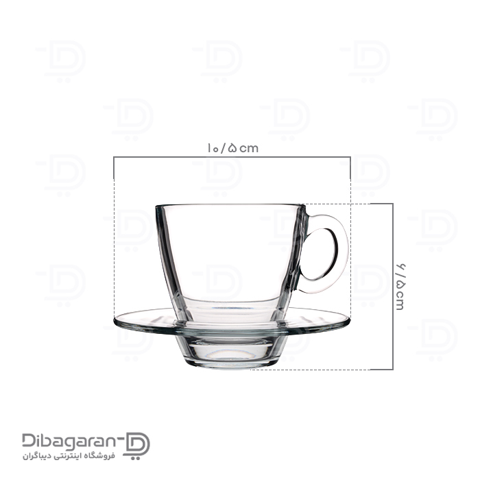 ست فنجان و نعلبکی قهوه خوری با گنجایش 72 میلی لیتر ارتفاع فنجان آن 5.5 سانتی متر و قطر 7.5 سانتی متر است. قطر نعلبکی این ست 10 سانتی متر است.
