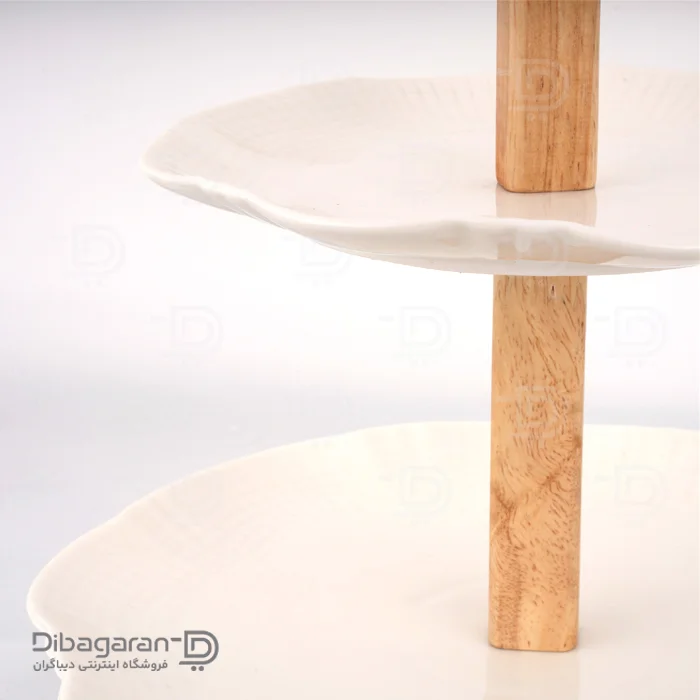 ظرف پذیرایی دو طبقه، ترکیبی از دو جنس چینی و چوب. این ظروف پذیرایی دو طبقه چوب چینی جدید و شیک از جمله محبوبترین ظروف برای سرو شیرینی در مهمانیهای رسمی است. در برخی از موارد افراد اقدام به خرید استند شیرینی خوری به عنوان ظروف تزئینی و مصرفی میکنند.