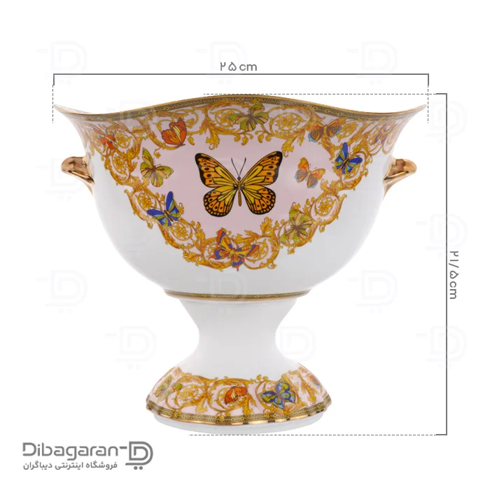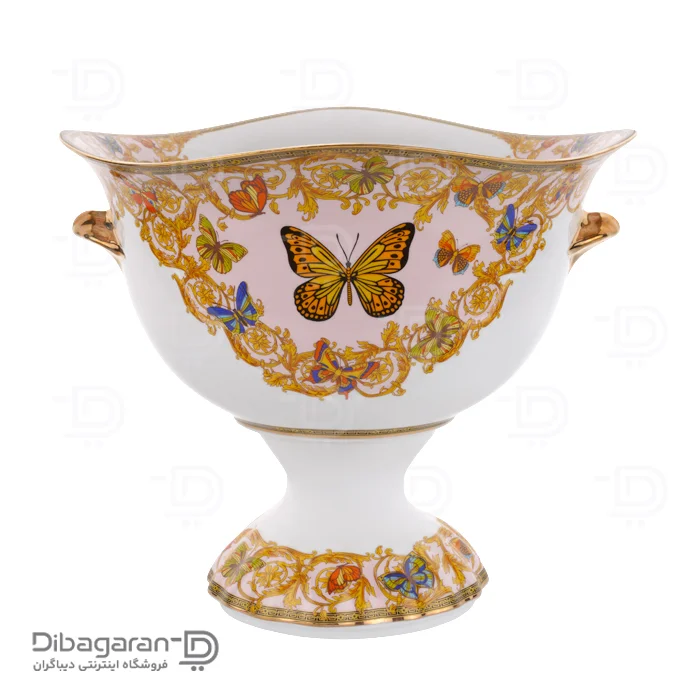 ظرف میوه خوری چینی پایه دار ریما کد 55310 مدل منحنی با طراحی طلاکاری نقوش پروانه به سبک کلاسیک، در دو مدل پایهدار و بدون پایه. این ظرف میوه خوری با طرح و نقوش طلا کاری شده، ساخته شده از بهترین مواد اولیه با کیفیت ساخت بالا است.