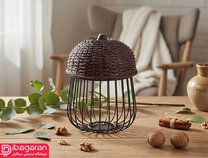 سبد نگهداری مدل بلوط با الهام مستقیم از فرم طبیعی بلوط طراحی شده است و همین موضوع در نگاه اول آن را از سبدهای معمولی متمایز می کند. ترکیب فرم گنبدی بالایی با بافت شبیه پوسته بلوط و بدنه فلزی مشبک در بخش پایینی، حس طبیعت و دست ساز بودن را به فضای آشپزخانه منتقل می کند. این طراحی فقط جنبه تزئینی ندارد، بلکه به شکلی انجام شده که هوا در اطراف محتویات جریان داشته باشد و گردو یا سایر خشکبار در شرایط بهتری نگهداری شوند. محصول در عین متفاوت بودن، اغراق آمیز نیست و به راحتی با فضاهای گرم و کلاسیک هماهنگ می شود.