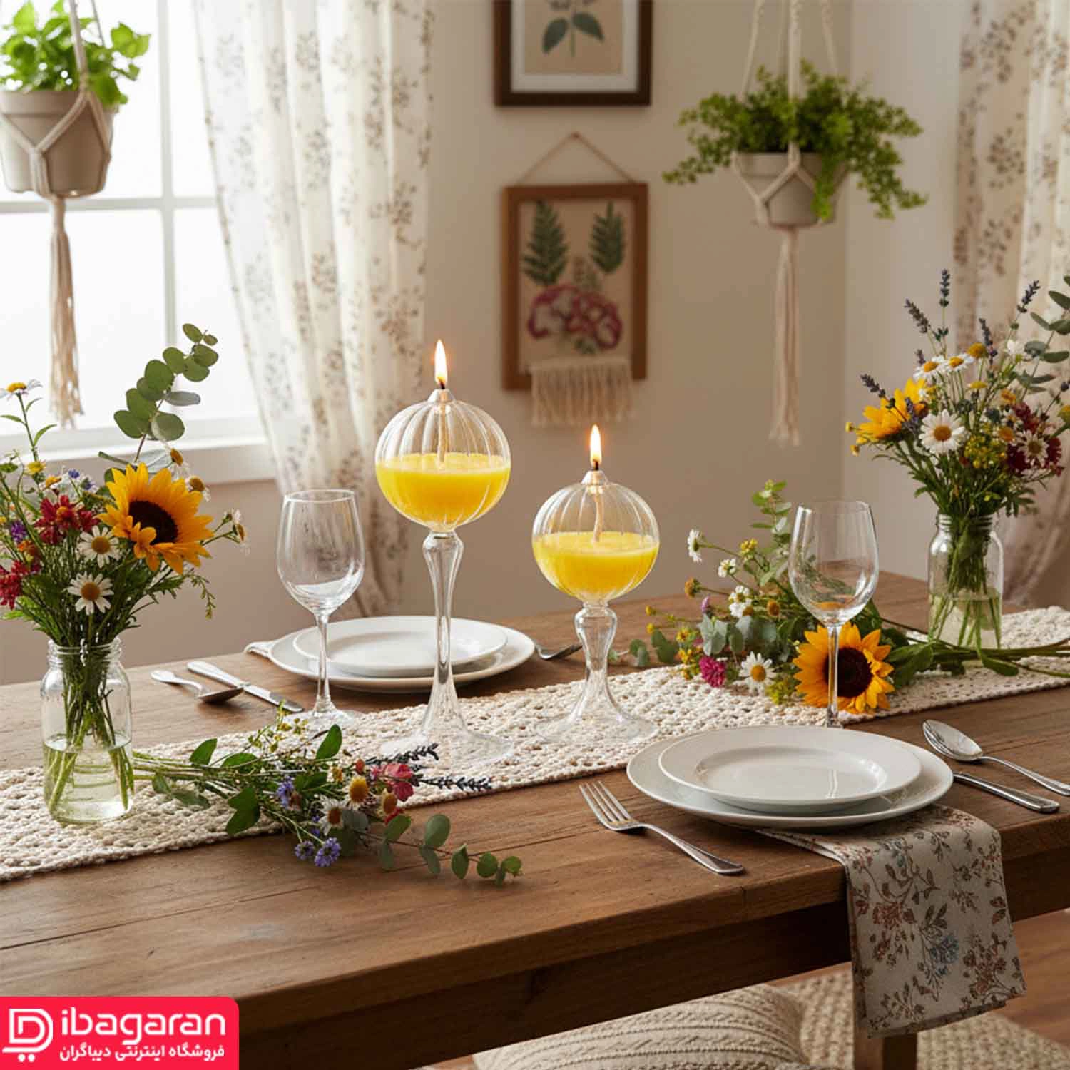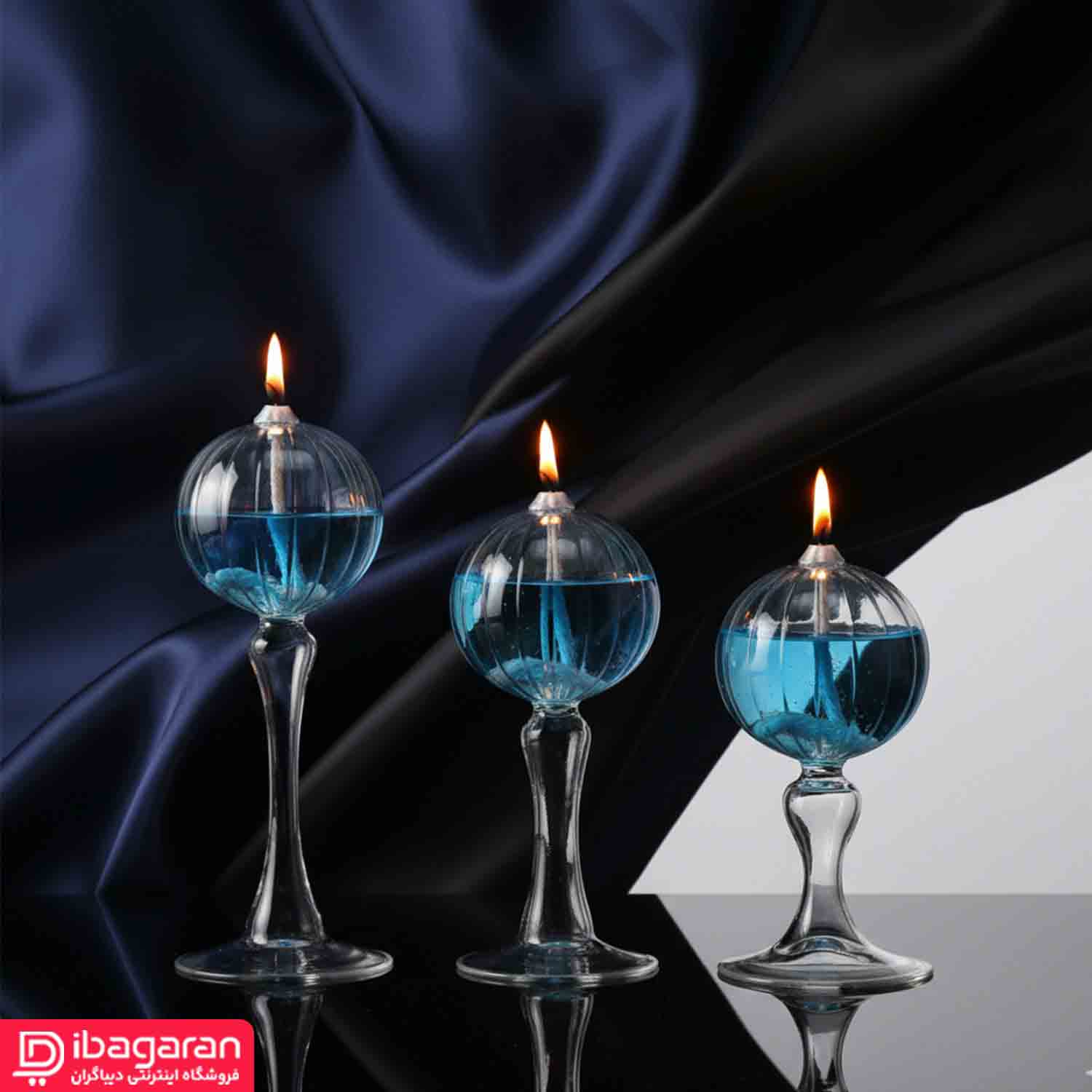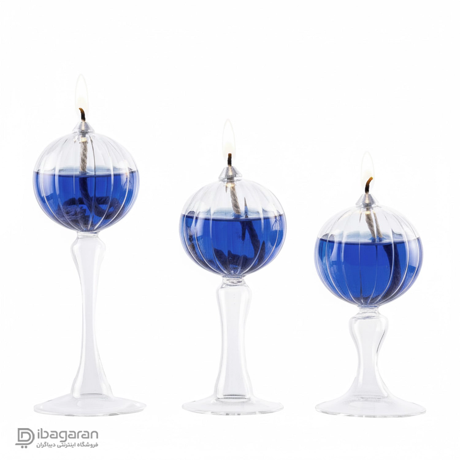 بدنهی این مدل از شیشهی شفاف و باکیفیت ساخته شده و خطوط شیاردار روی حباب، انعکاس نور را زیباتر میکند. وقتی داخل این شمعدانها مایع پارافین رنگی ریخته میشود مثل همین رنگ آبی در تصویر نور شعله در میان شیشهی شفاف پخش میشود و جلوهای بسیار آرامبخش و حرفهای ایجاد میکند. همین ویژگی باعث شده این مدل برای فضاهای مینیمال، مدرن، کلاسیک و حتی دکورهای بوهمین انتخابی جذاب باشد.