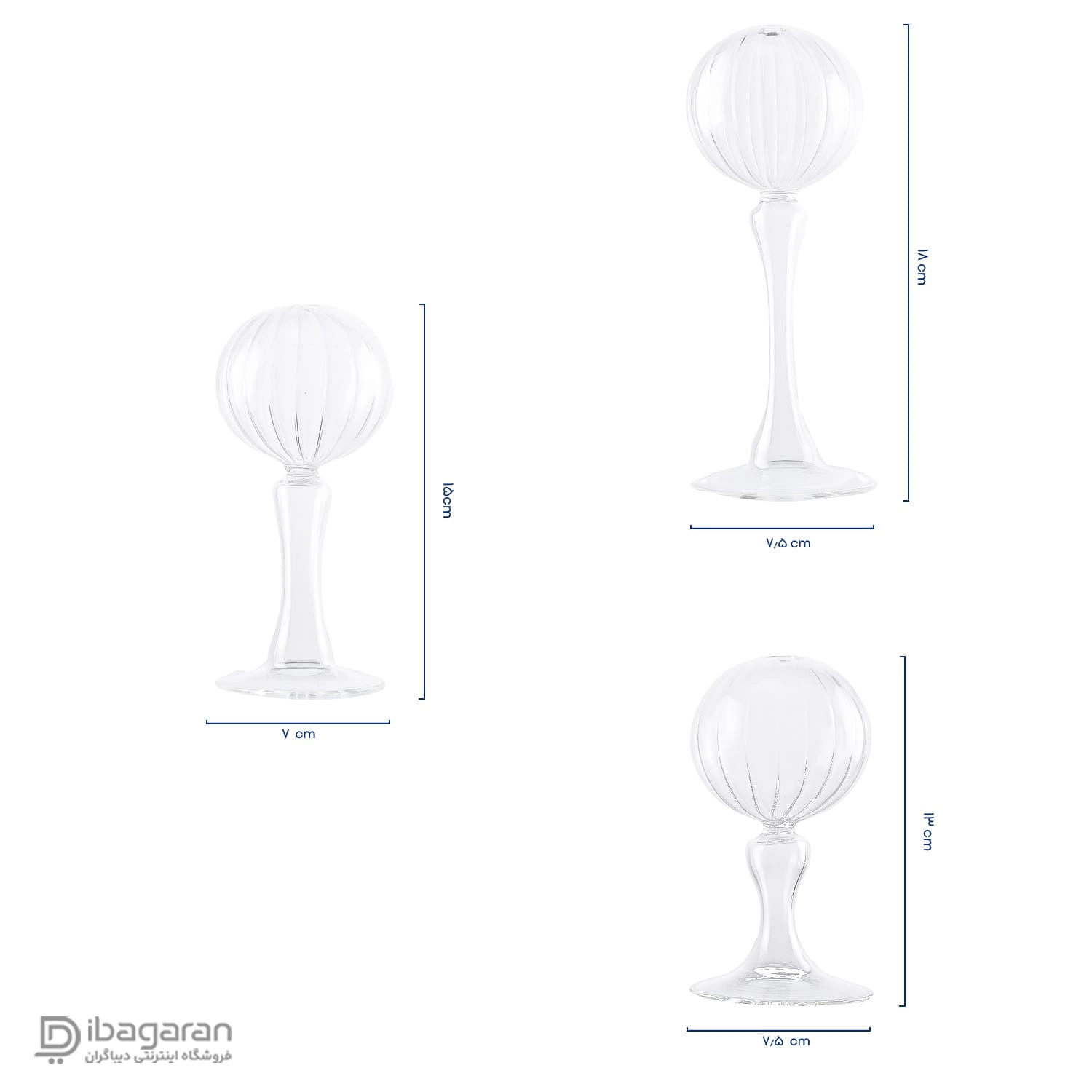 ست ۳ عددی جاشمعی حبابی پایه دار مدل شیاردار با طراحی ظریف و بدنه شیشه ای شفاف، یکی از انتخاب های شیک و خاص برای نورپردازی دکوراتیو در فضاهای مختلف است. فرم حبابی شیار دار در قسمت بالایی، نور شمع را به شکلی نرم و چشم نواز پخش می کند و پایه بلند و خوش فرم آن جلوه ای لوکس و متعادل به چیدمان می بخشد.