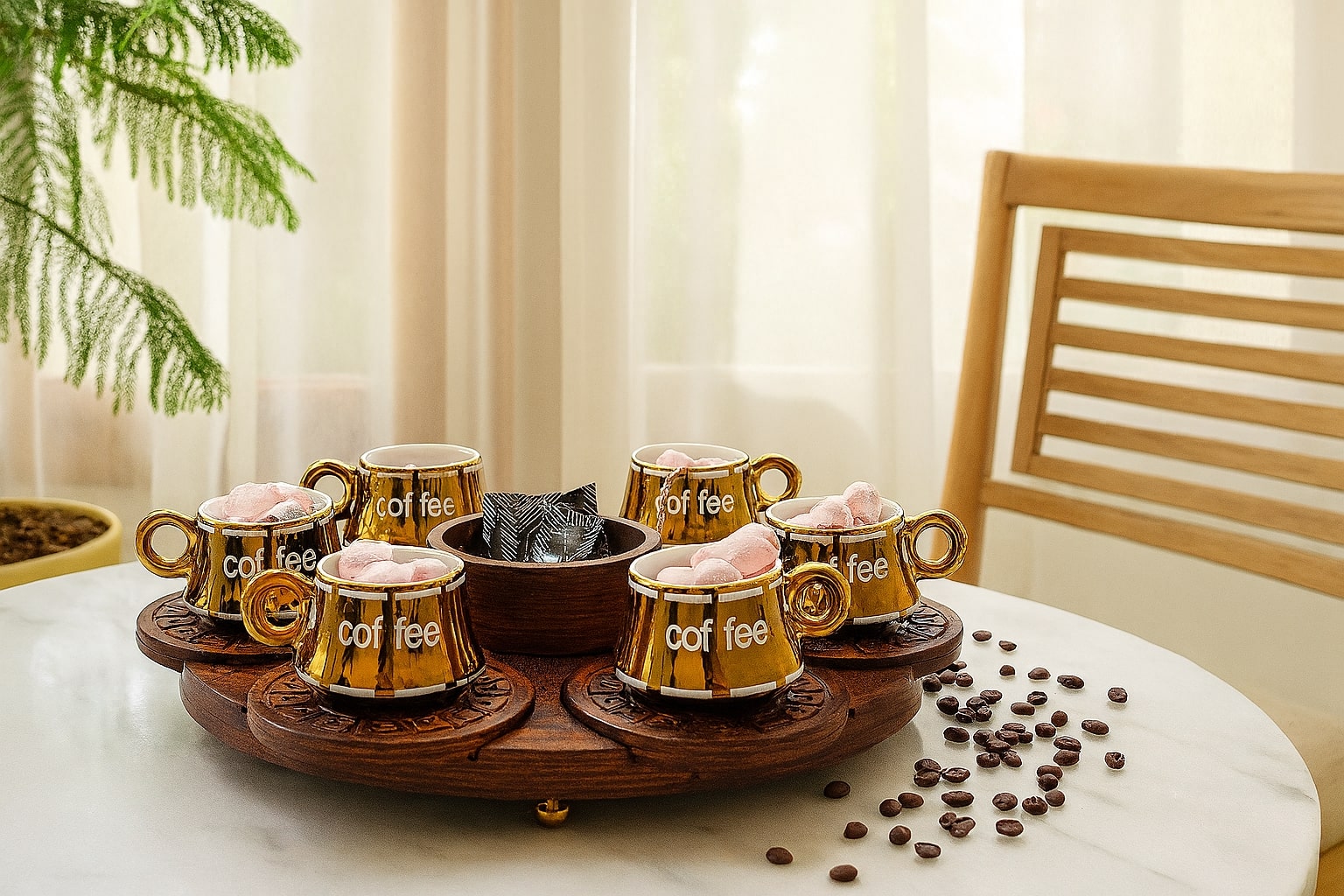 این ست قهوه خوری مناسب شش نفر است. این ست با یک سینی چوبی، شش عدد فنجان چینی، شش عدد زیر لیوانی چوبی و یک قندان چوبی سرویسی زیبا برای سرو قهوه، چای و انواع نوشیدنی گرم است. شما میتوانید از این ست برای پذیرایی از مهمان یا مصارف روزانه استفاده کنید.