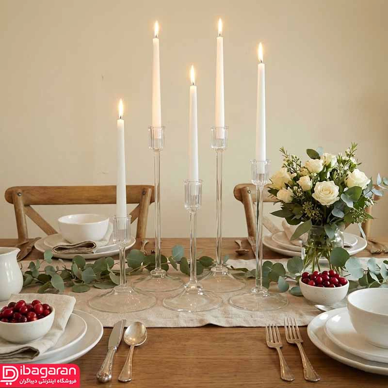 وزن مناسب پایه باعث میشود شمعدان روی سطوح صاف مانند میز، کنسول یا شلف بدون نگرانی از تکان خوردن قرار گیرد. این ساختار باعث شده محصول برای مراسم رسمی، میز شام، جشنها، عکاسی دکوراتیو و حتی استفاده روزمره بسیار کاربردی باشد. شفافیت کامل جسم باعث میشود این شمعدان بهراحتی با سبکهای مختلف دکوراسیون از مدرن و مینیمال گرفته تا کلاسیک و مجلل هماهنگ شود.