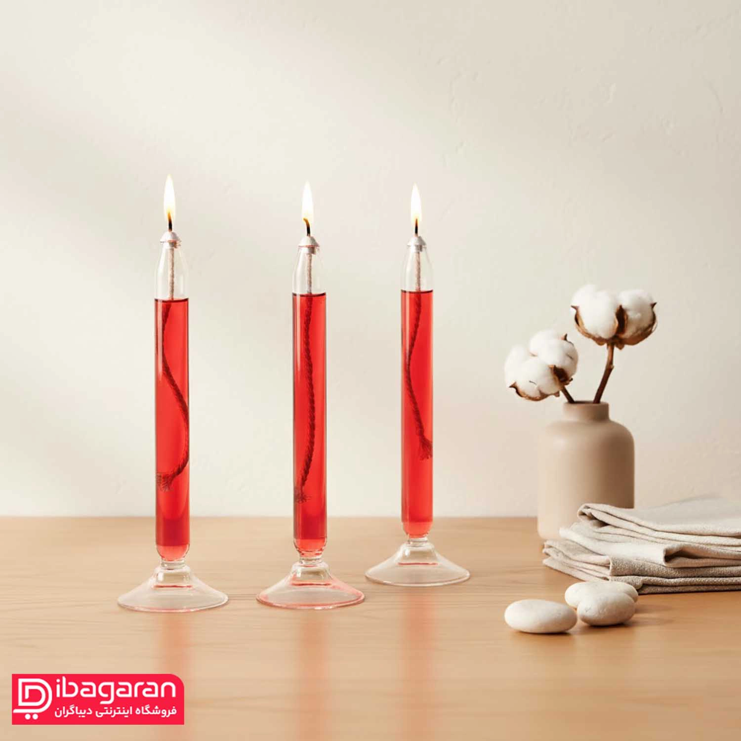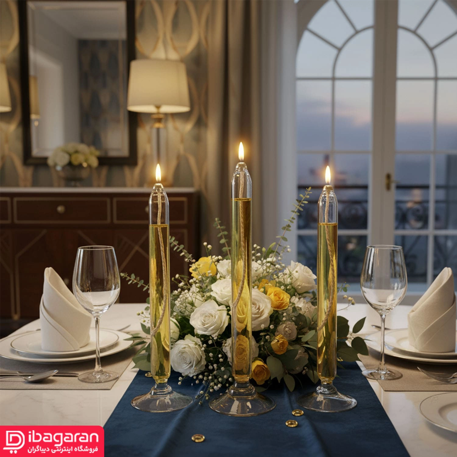 در این تصویر، داخل شمعدانها مایع پارافین به رنگ سبز ریخته شده؛ رنگی که حالوهوای آرام، شیک و خنک به فضا میدهد. مایع درون شمعدان، هنگام روشن شدن شمع، شفافتر و درخشانتر دیده میشود و همین ویژگی باعث میشود در عکسهای دکوراتیو و چیدمانهای خانگی بسیار چشمگیر باشد. فیتیلهی کنفی داخل شمعدان ها بدون دود و با شعلهای پایدار میسوزد و این یعنی در استفاده طولانیمدت، هم تمیز میماند و هم بوی ناخوشایند تولید نمیکند.